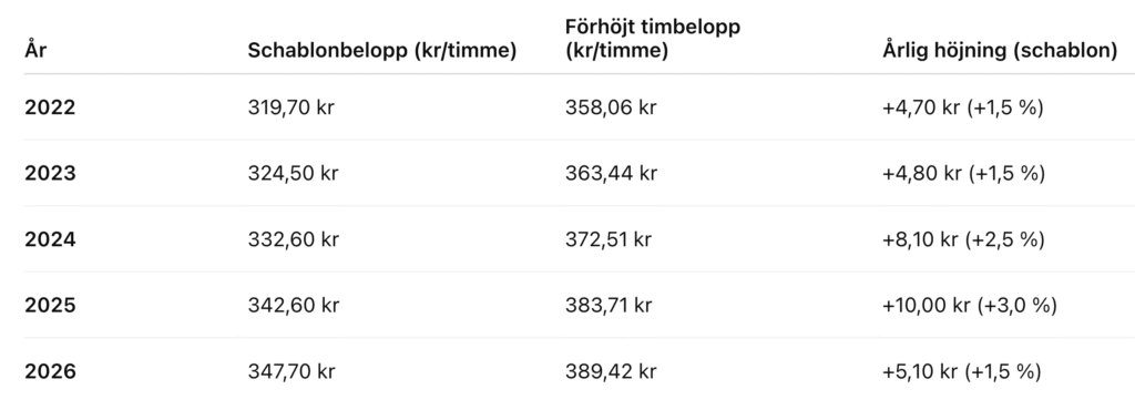 I vissa fall kan ett förhöjt timbelopp beviljas när schablonbeloppet inte räcker för att täcka faktiska kostnader. Taket för förhöjt timbelopp 2026 ligger på 389,42 kr/timme.